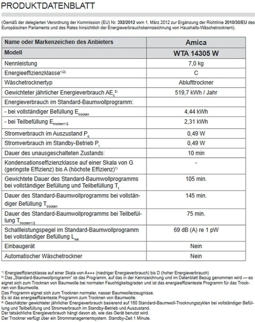 Amica WTA 14305 W, Ablufttrockner, 7 Kg, Weiß