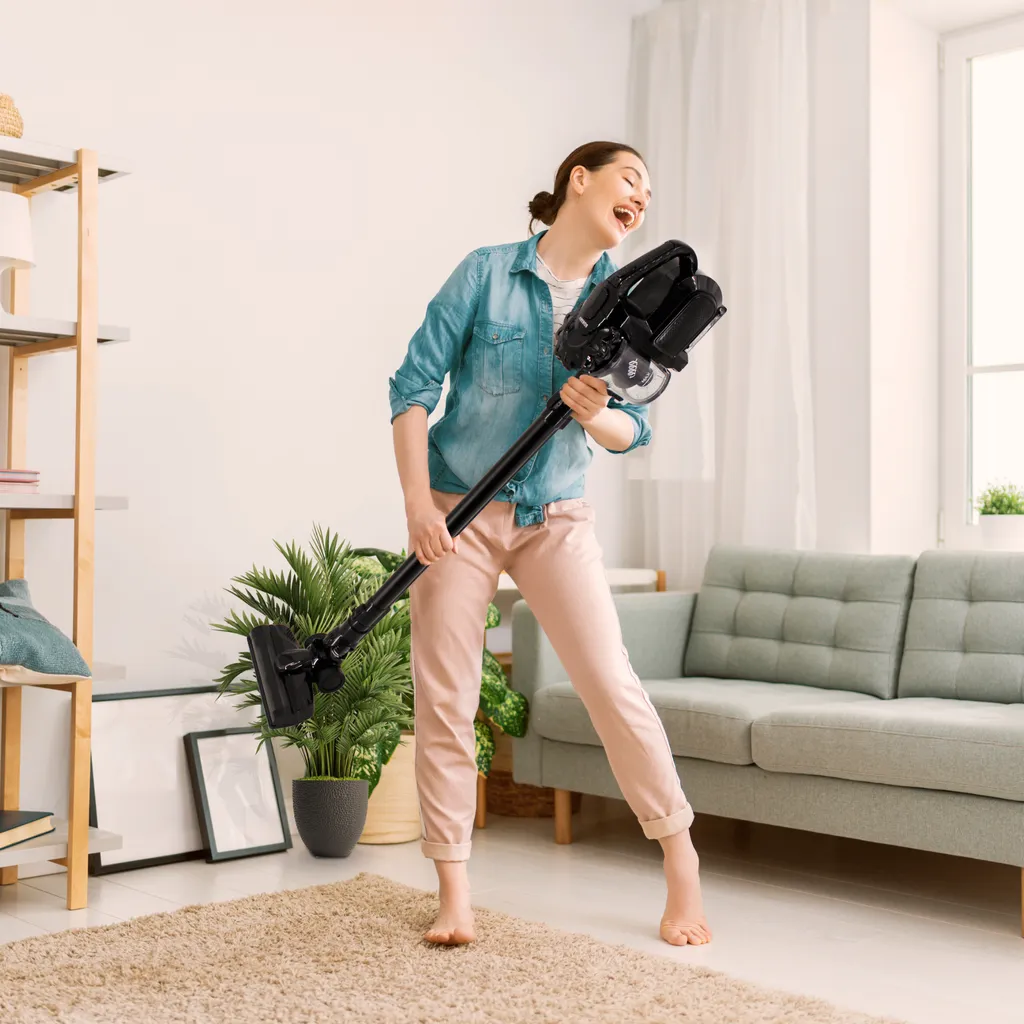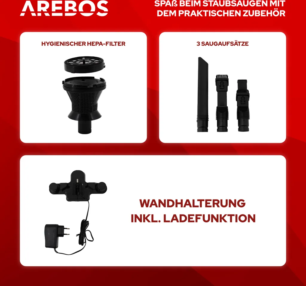 AREBOS Akku Staubsauger, 2-in-1 Hand- Und Bodenstaubsauger, 2 Leistungsstarke Saugmodi, Beutellos, Kabellos Bis Zu 55 Minuten, Mit Wandladestation, Schwarz