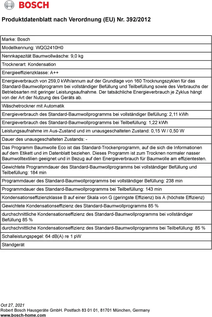 Bosch Serie | 6, Wärmepumpentrockner, 9 Kg WQG2410H0 AntiVibration Design, SensitiveDrying System