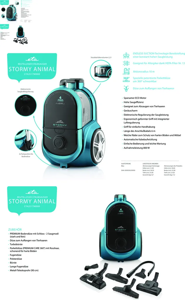 ETA STORMY ANIMAL Beutelloser Staubsauger ETA251790000, 800 W, ENDLESS SUCTION-Technologie, HEPA-Filter, Nr. 13 , Aktionsradius 10 M, Kabellänge 7 M