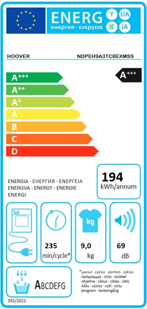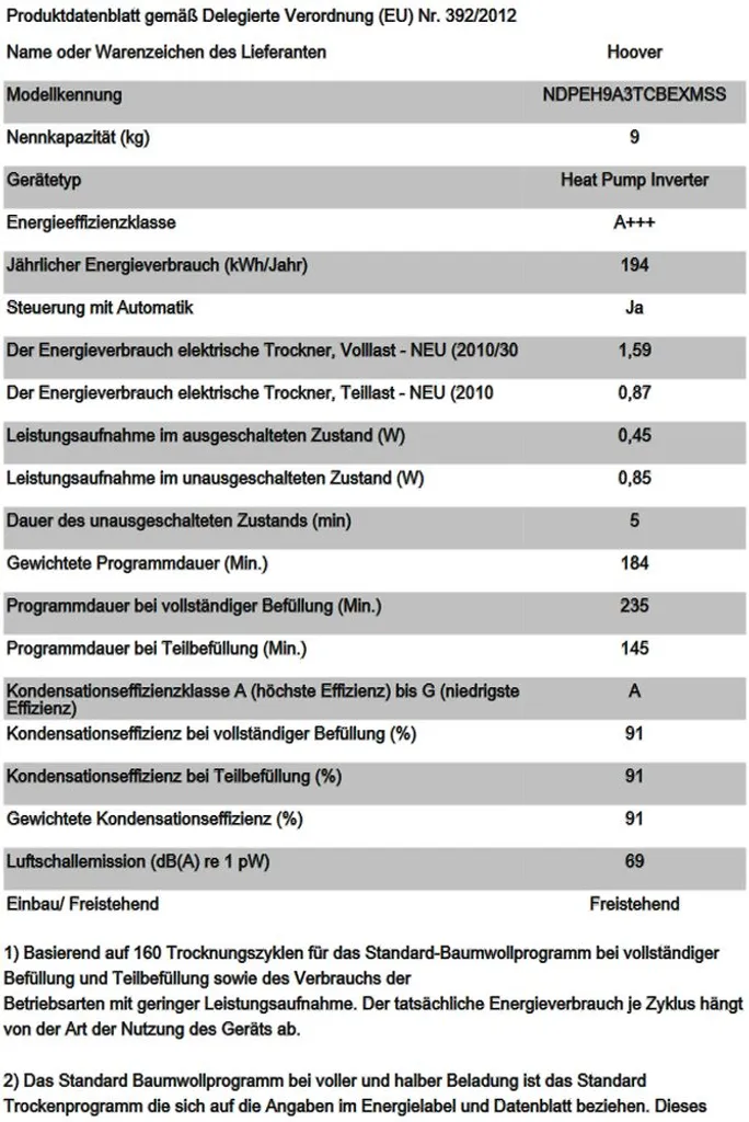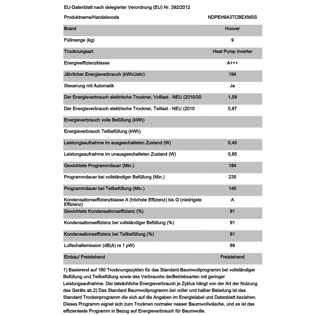 HOOVER NDPEH9A3TCBEXMSS WÄRMEPUMPENTROCKNER H-DRY500 Füllmenge 1-9 Kg