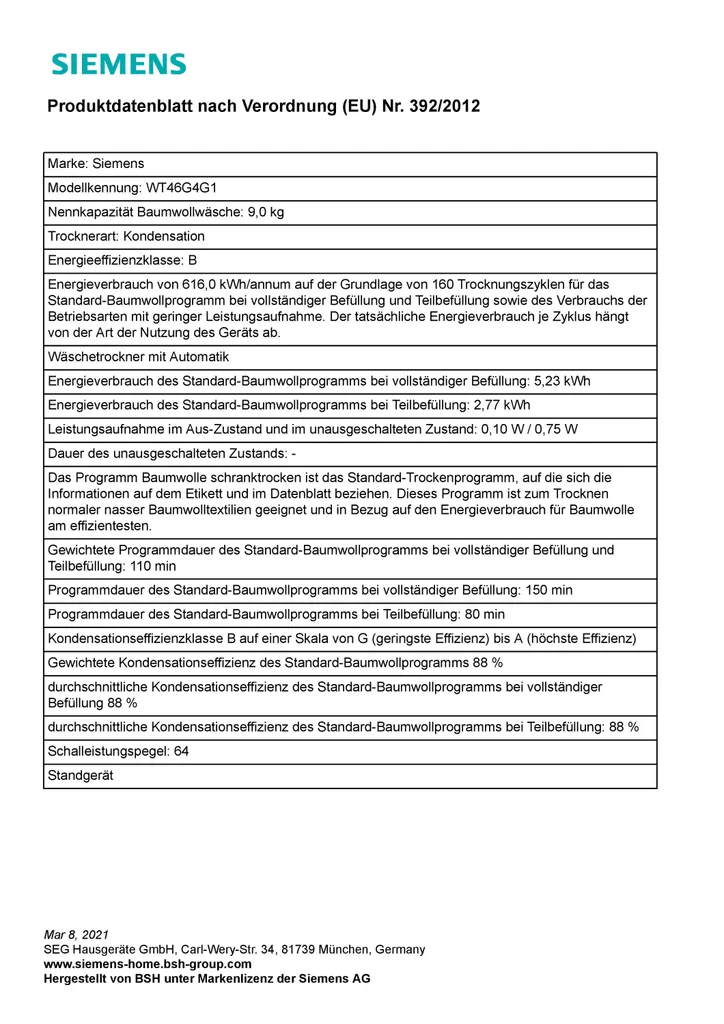Siemens WT 46 G4 G1 Kondenstrockner9kg B AutoDry LED-Displ.EasyCleanF